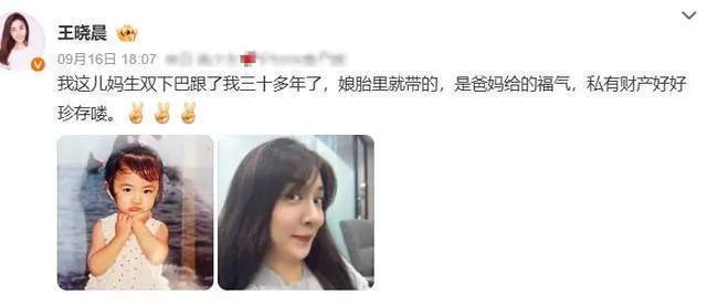 关于王晓晨双下巴一事,在网络上传得沸沸扬扬。第二天,她在个人社交平台上晒出自己小时候的照片。配文:我这儿妈生双下巴跟着我30多年了,娘胎里就带的…。